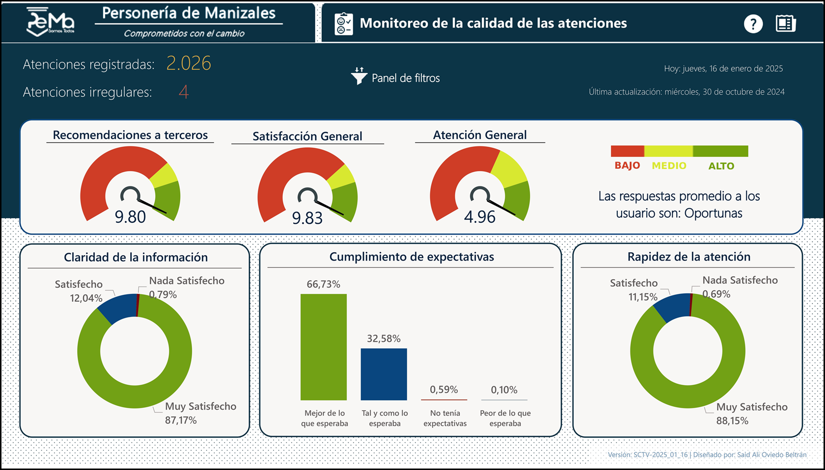 Resumen: Diseño e implementación de un tablero de control interactivo en Power BI Service para el seguimiento y análisis de métricas del proceso de atención al usuario en la Personería de Manizales. Este tablero servirá como una herramienta clave para monitorear la calidad del servicio, facilitando la extracción visual de insights, apoyando la toma de decisiones estratégicas.