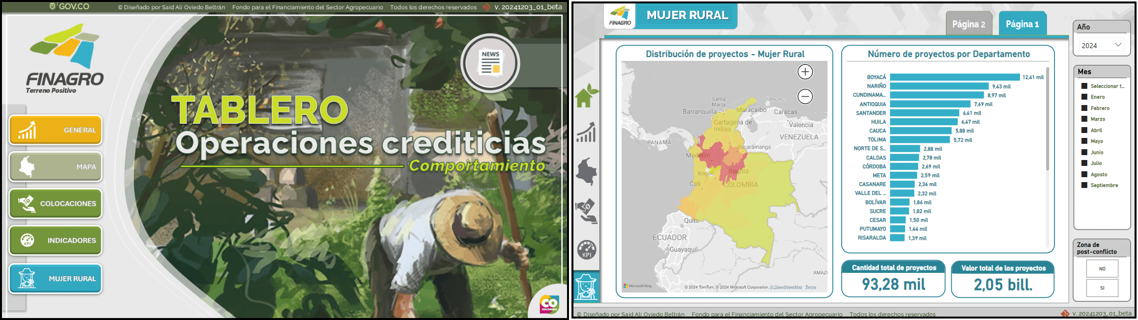 Resumen: Análisis exploratorio de datos y visualización de insights y KPIs basado en el historial de operaciones crediticias del Fondo para el Financiamiento del Sector Agropecuario (FINAGRO) entre enero de 2021 y septiembre de 2024. El estudio se centra en evaluar el impacto de los créditos colocados en tres dimensiones clave: inclusión financiera, diversificación agropecuaria y equidad de género.